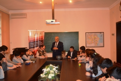 | Azərbaycan Respublikası Təhsil Nazirliyinin Təhsildə inkişaf və innovasiyalar üzrə birinci qrant müsabiqəsi çərçivəsində həyata keçirilən “Arxeoməktəb: Keçmişdən gələcəyə - Tarix fənninin tədrisinin davamlılığının artırılması” layihəsinin icra planına uyğun olaraq noyabrın 10-da Seyid Cəfər Pişəvəri adına Respublika Humanitar Fənlər Gimnaziyasının konfrans zalında “məktəbli arxeoloqlar”ın AMEA-nın müxbir üzvü Vəli Əliyevlə görüşü təşkil edilib. |